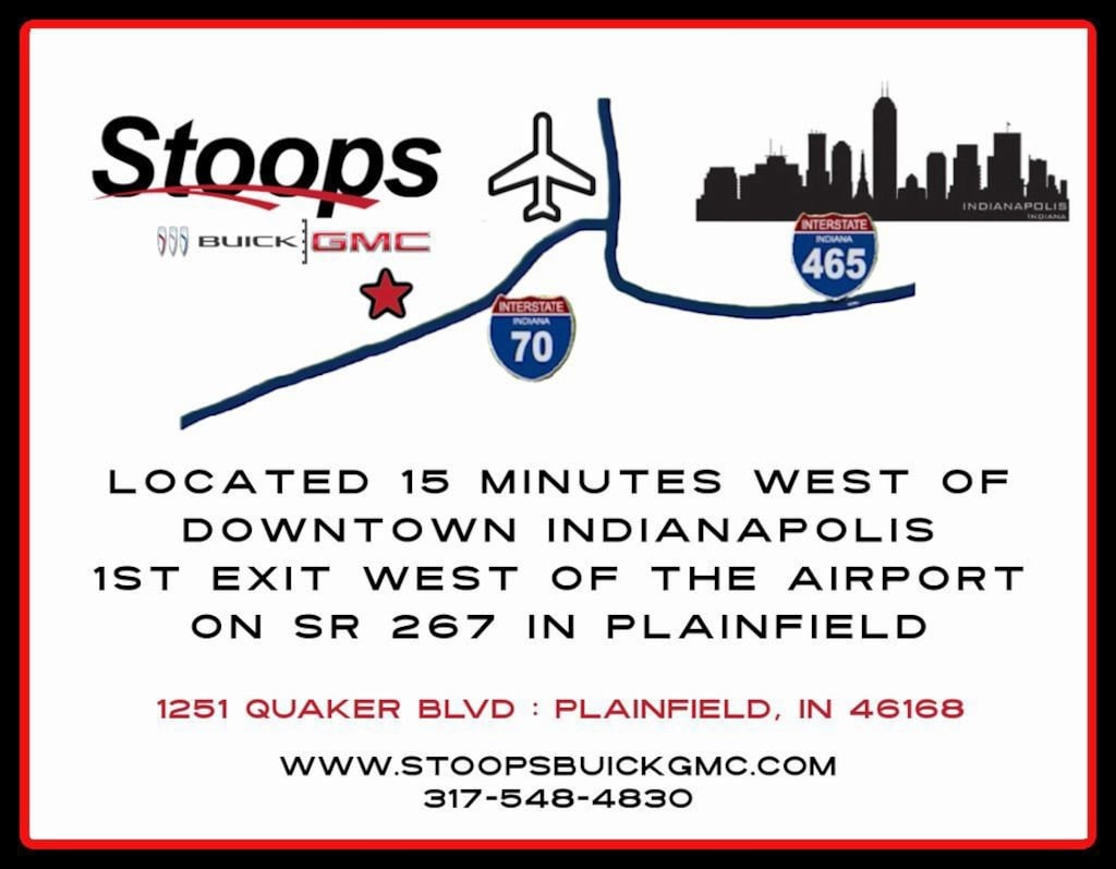 Tax, title, doc fee ($237), optional accessories, extra. We invite you in to take a test drive! Stoops Buick-GMC in Plainfield, Indiana, family owned and proudly serving our community since 1990. We have an A+ rating with the Better Business Bureau and have been a CarFax Top Rated Dealer 5 years in a row! Stoops Buick-GMC: conveniently located only 5 minutes west of the airport and mile and a half north of I-70 on SR 267 in Plainfield. Proudly serving Plainfield and the surrounding communities of Greenwood, Indianapolis, Mooresville, Avon, Brownsburg and more. Call us direct at 317-839-7771! Thank you for the opportunity to earn your business!