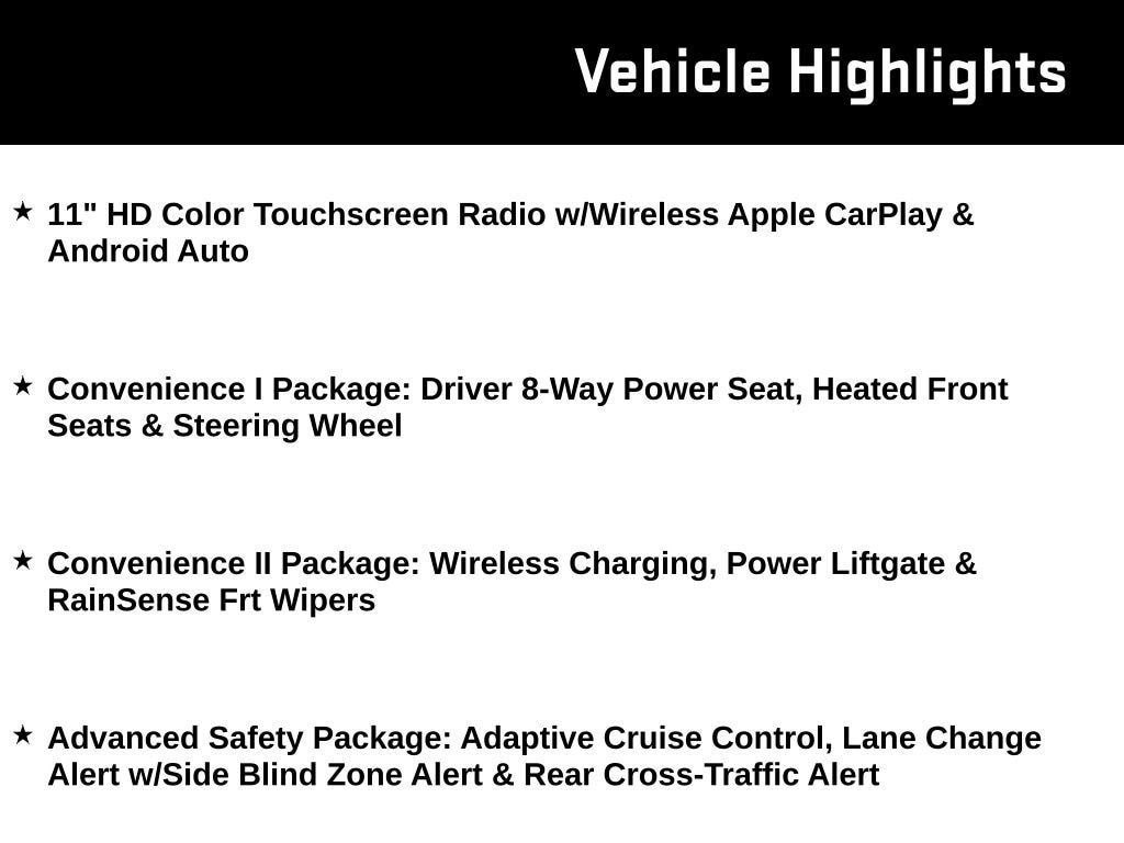 11 HD Color Touchscreen Radio w/Wireless Apple CarPlay & Android Auto, Convenience I Package: Driver 8-Way Power Seat, Heated Front Seats & Steering Wheel, Convenience II Package: Wireless Charging, Power Liftgate & RainSense Frt Wipers, Advanced Safety Package: Adaptive Cruise Control, Lane Change Alert w/Side Blind Zone Alert & Rear Cross-Traffic Alert.