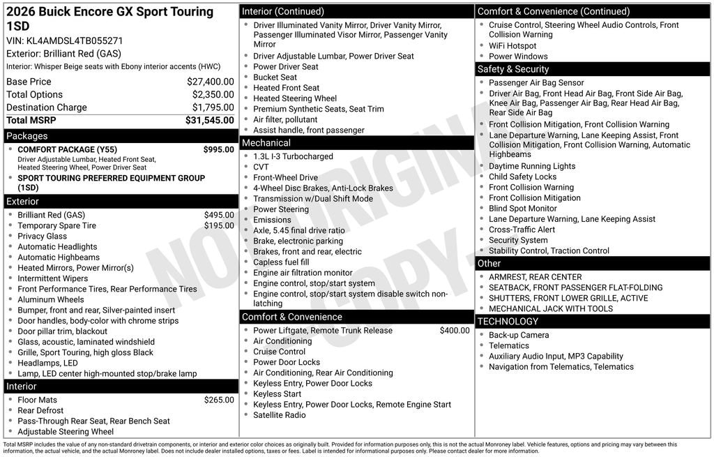 Introducing the 2026 Buick Encore GX Sport Touring - a compact SUV that seamlessly blends style, performance, and cutting-edge technology. This meticulously crafted vehicle is the perfect companion for your urban adventures and weekend getaways.Tailored to your active lifestyle, the Encore GX Sport Touring boasts a host of premium features, including:- Comfort Package- Brilliant Red exterior color- Power liftgateElevate your driving experience with the Encore GX's impressive performance. Powered by the ECOTEC 1.3L Turbo engine and paired with a smooth-shifting CVT transmission, this SUV delivers an exceptional blend of efficiency and responsiveness, with an EPA-estimated 29 MPG in the city and 31 MPG on the highway.Stepping inside, you'll be greeted by a cabin that seamlessly combines style and functionality. Indulge in the comfort of the 8-way power driver's seat, 2-way power lumbar support, and the heated steering wheel. The flat-folding front passenger seatback and rear center armrest ensure maximum versatility, allowing you to adapt to your ever-changing needs.Stay connected and entertained with the Encore GX's state-of-the-art technology. Wireless Apple CarPlay and Wireless Android Auto integration keep you in touch with your digital world, while the 6-speaker audio system delivers a premium listening experience.Safety is paramount, and the Encore GX is equipped with a comprehensive suite of advanced driver-assistance features, including Electronic Stability Control, Brake Assist, and a host of airbags, ensuring your peace of mind on every journey.Elevate your driving experience with the 2026 Buick Encore GX Sport Touring. This exceptional SUV is ready to take you further, in both style and substance. Schedule a test drive today and discover the perfect balance of performance, technology, and comfort.Tax, title, documentation fee ($237), optional accessories, and additional fees may apply. Availability and pricing are subject to change.Take a test drive today at Stoops Buick GMC in Plainfield, IN family-owned and proudly serving the community since 1990. We're a trusted Buick and GMC dealership near Indianapolis with an A+ Better Business Bureau rating and a CARFAX Top-Rated Dealer (5 years running).Conveniently located in Plainfield, Indiana, just 5 minutes west of Indianapolis International Airport and north of I-70 on SR 267, we proudly serve drivers from Plainfield, Indianapolis, Greenwood, Avon, Brownsburg, Mooresville, and surrounding areas.Call us directly at 317-839-7771. Thank you for the opportunity to earn your business!*Includes all applicable incentives. We strive to ensure the accuracy of the information on this site; however, errors may occur. To verify details, please call 317-839-7771 or visit us in-store. Price includes discounts and rebates available to the general public, and dealer installed items. You may qualify for additional rebates. , Doc Fee Taxes and license are extra. Use of factory sponsored finance or lease programs may affect final vehicle price, and are subject to credit approval. Subject to prior sale.$3000 - Purchase Allowance for Current Eligible Non-GM Owners and Lessees. Exp. 03/02/2026