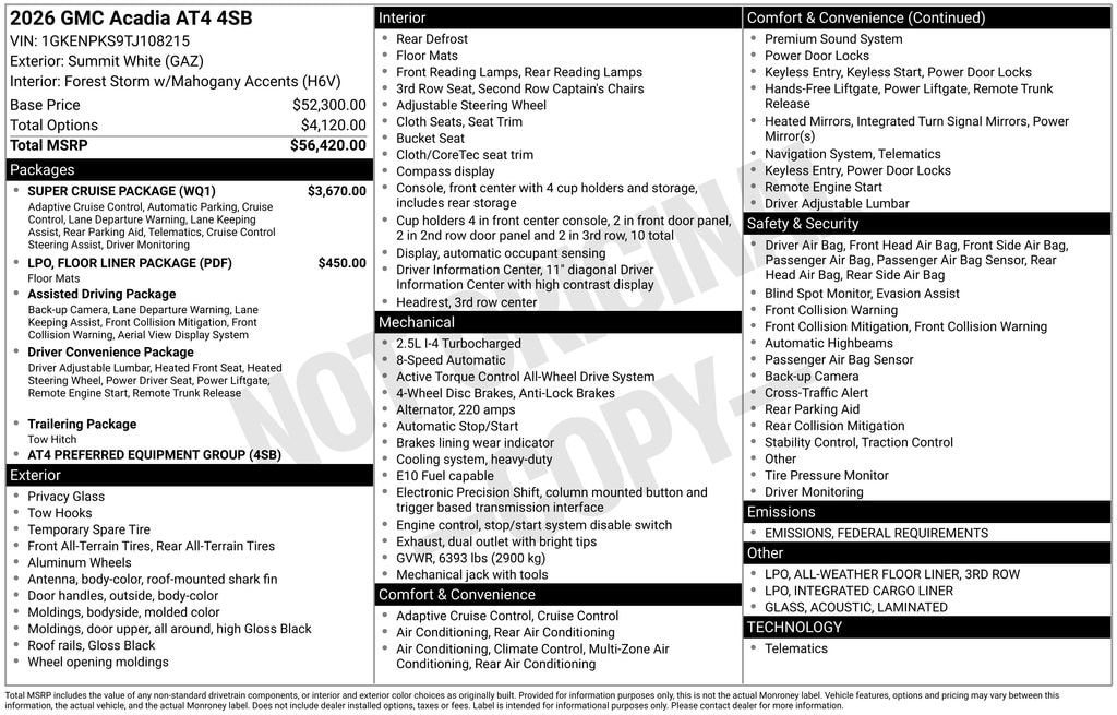 2-Way Driver Power Lumbar Seat Adjuster, 3 Years of OnStar One, 6-Way Power Front Passenger Seat Adjuster, 7-Passenger Seating (2-2-3 Seating Configuration), 8-Way Power Driver Seat Adjuster, Bose Premium 12-Speaker System w/Sub-Woofer, Driver Attention Assist, Enhanced Automatic Parking Assist, Front Passenger Power Lumbar Seat Adjuster, Heated Driver & Front Passenger Seats, Navigation System, Power Liftgate, Preferred Equipment Group 4SB, Radio: 15 Premium GMC Infotainment System, SiriusXM w/360L, Super Cruise, Super Cruise Package, Wheels: 18 x 8 Dark Machined Aluminum.