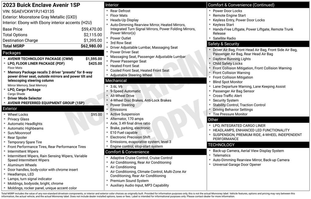 Recent Arrival!2023 Buick Enclave Avenir Moonstone Gray Metallic AWD 3.6L V6 SIDI VVTOdometer is 17595 miles below market average!Clean CARFAX.***LIFETIME POWERTRAIN WARRANTY*** (UNLIMITED TIME AND MILES, SEE DEALER FOR COMPLETE DETAILS), *** Local Trade ***, *** Wireless Apple CarPlay - Android Auto ***, * POWER SUNROOF/MOONROOF *, * BOSE PREMIUM SOUND SYSTEM *, * REMOTE START *, * HEATED & VENTILATED FRONT SEATS *, * HEATED STEERING WHEEL *, * HEATED 2ND ROW SEATS *, * HD SURROUND VISION CAMERA *, * HD REAR VISION CAMERA *, * AUTOMATIC EMERGENCY BRAKING *, * FORWARD COLLISION ALERT *, * FRONT PEDESTRIAN BRAKING *, * FRONT AND REAR PARK ASSIST *, * LANE CHANGE ALERT WITH SIDE BLIND ZONE ALERT *, * LANE KEEP ASSIST W/ LANE DEPARTURE WARNING *, * LANE DEPARTURE WARNING *, * REAR CROSS TRAFFIC ALERT *, * SAFETY ALERT SEAT *, * SIDE BLIND ZONE ALERT *, ADAPTIVE CRUISE CONTROL, POWER LIFTGATE, Heads-Up Display.Tax, title, doc fee ($237), optional accessories, extra. We invite you in to take a test drive! Stoops Buick-GMC in Plainfield, Indiana, family owned and proudly serving our community since 1990. We have an A+ rating with the Better Business Bureau and have been a CarFax Top Rated Dealer 5 years in a row! Stoops Buick-GMC: conveniently located only 5 minutes west of the airport and mile and a half north of I-70 on SR 267 in Plainfield. Proudly serving Plainfield and the surrounding communities of Greenwood, Indianapolis, Mooresville, Avon, Brownsburg and more. Call us direct at 317-839-7771! Thank you for the opportunity to earn your business!We strive to ensure the accuracy of the information on this site. However, mistakes can happen. To verify any information listed on this site please call us at 317-839-7771 or visit us in store.