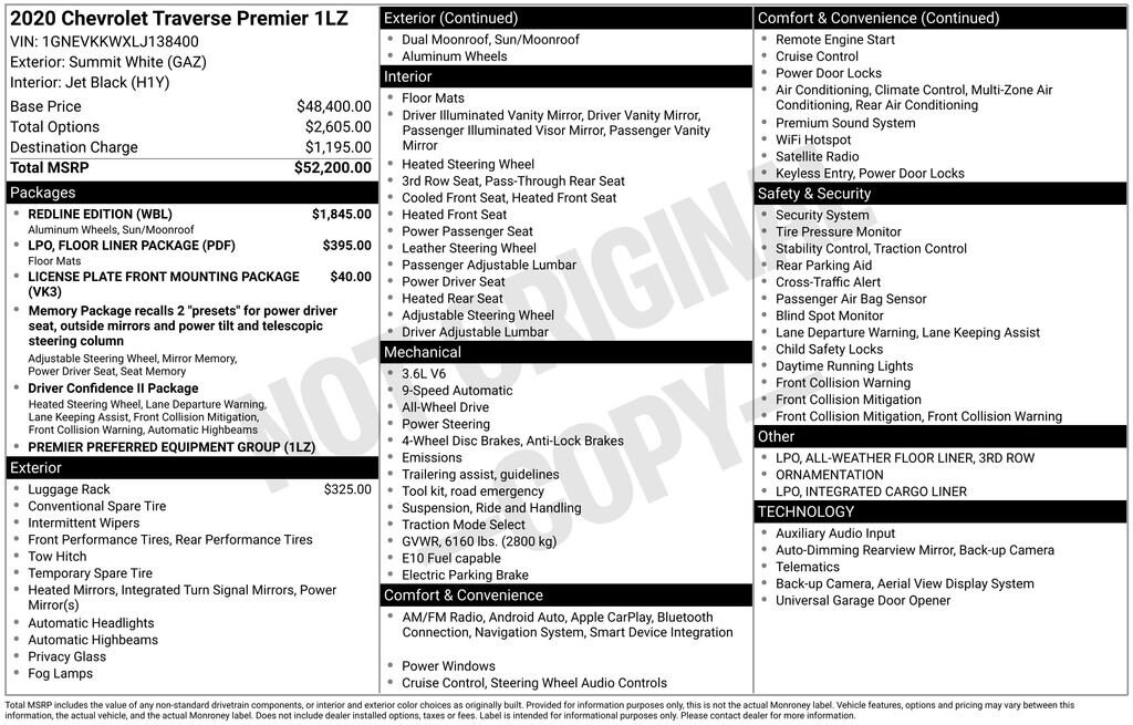 2020 Chevrolet Traverse Premier Summit White AWD 3.6L V6 SIDI VVT