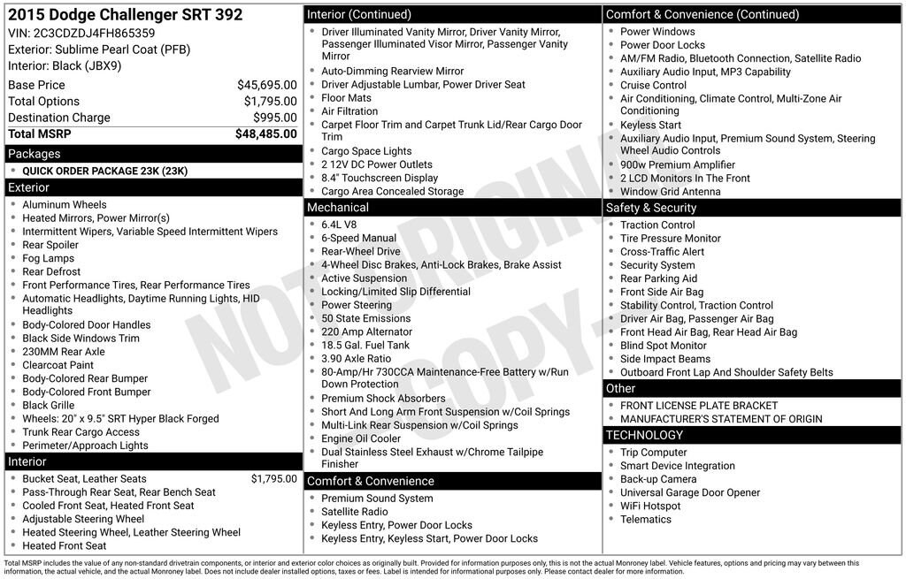 Recent Arrival!2015 Dodge Challenger SRT 392 Sublime Pearl Coat RWD SRT HEMI 6.4L V8Awards:* JD Power Automotive Performance, Execution and Layout (APEAL) Study, Initial Quality Study (IQS), Vehicle Dependability Study * JD Power Automotive Performance, Execution and Layout (APEAL) Study, Initial Quality Study (IQS), Vehicle Dependability Study (VDS) * 2015 KBB.com Best Buy Awards Finalist*** Local Trade ***, * HEATED & VENTILATED FRONT SEATS *, * HEATED STEERING WHEEL *, * REAR VISION CAMERA *, * REAR PARK ASSIST *, * SIDE BLIND ZONE ALERT *, Front dual zone A/C, harman/kardon® Speakers, Heated door mirrors, Power door mirrors.Tax, title, doc fee ($237), optional accessories, extra. We invite you in to take a test drive! Stoops Buick-GMC in Plainfield, Indiana, family owned and proudly serving our community since 1990. We have an A+ rating with the Better Business Bureau and have been a CarFax Top Rated Dealer 5 years in a row! Stoops Buick-GMC: conveniently located only 5 minutes west of the airport and mile and a half north of I-70 on SR 267 in Plainfield. Proudly serving Plainfield and the surrounding communities of Greenwood, Indianapolis, Mooresville, Avon, Brownsburg and more. Call us direct at 317-839-7771! Thank you for the opportunity to earn your business!We strive to ensure the accuracy of the information on this site. However, mistakes can happen. To verify any information listed on this site please call us at 317-839-7771 or visit us in store.