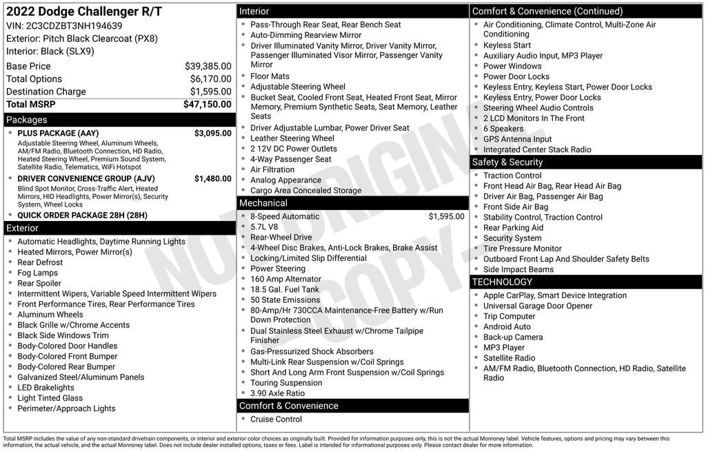 2022 Dodge Challenger R/T Pitch Black Clearcoat RWD HEMI 5.7L V8 Multi Displacement VVT