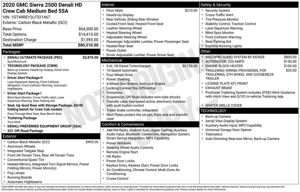 Recent Arrival!2020 GMC Sierra 2500HD Denali Carbon Black Metallic 4WD Duramax 6.6L V8 TurbodieselPriced below KBB Fair Purchase Price!Clean CARFAX.*** Local Trade ***, * POWER SUNROOF/MOONROOF *, * BOSE PREMIUM SOUND SYSTEM *, * REMOTE START *, * HEATED & VENTILATED FRONT SEATS *, * HEATED STEERING WHEEL *, * HEATED 2ND ROW SEATS *, * HD SURROUND VISION CAMERA *, * HD REAR VISION CAMERA *, * AUTOMATIC EMERGENCY BRAKING *, * FORWARD COLLISION ALERT *, * FRONT PEDESTRIAN BRAKING *, * FRONT AND REAR PARK ASSIST *, * LANE CHANGE ALERT WITH SIDE BLIND ZONE ALERT *, * LANE KEEP ASSIST W/ LANE DEPARTURE WARNING *, * LANE DEPARTURE WARNING *, * REAR CROSS TRAFFIC ALERT *, * SAFETY ALERT SEAT *, * SIDE BLIND ZONE ALERT *, ADAPTIVE CRUISE CONTROL.Tax, title, doc fee ($237), optional accessories, extra. We invite you in to take a test drive! Stoops Buick-GMC in Plainfield, Indiana, family owned and proudly serving our community since 1990. We have an A+ rating with the Better Business Bureau and have been a CarFax Top Rated Dealer 5 years in a row! Stoops Buick-GMC: conveniently located only 5 minutes west of the airport and mile and a half north of I-70 on SR 267 in Plainfield. Proudly serving Plainfield and the surrounding communities of Greenwood, Indianapolis, Mooresville, Avon, Brownsburg and more. Call us direct at 317-839-7771! Thank you for the opportunity to earn your business!We strive to ensure the accuracy of the information on this site. However, mistakes can happen. To verify any information listed on this site please call us at 317-839-7771 or visit us in store.