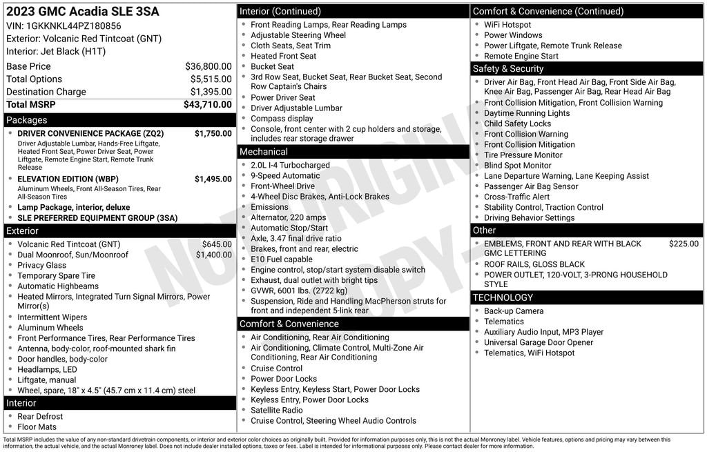 2023 GMC Acadia SLE Volcanic Red Tintcoat FWD 2.0L TurbochargedPriced below KBB Fair Purchase Price! Odometer is 7055 miles below market average!CARFAX One-Owner. Clean CARFAX.***LIFETIME POWERTRAIN WARRANTY*** (UNLIMITED TIME AND MILES, SEE DEALER FOR COMPLETE DETAILS), *** Wireless Apple CarPlay - Android Auto ***, * POWER SUNROOF/MOONROOF *, * REMOTE START *, * HEATED FRONT SEATS *, * FORWARD COLLISION ALERT *, * FRONT AND REAR PARK ASSIST *, * LANE CHANGE ALERT WITH SIDE BLIND ZONE ALERT *, * LANE KEEP ASSIST W/ LANE DEPARTURE WARNING *, * REAR CROSS TRAFFIC ALERT *, * REAR VISION CAMERA *, * SIDE BLIND ZONE ALERT *, ADAPTIVE CRUISE CONTROL, POWER LIFTGATE.Tax, title, doc fee ($251.05), optional accessories, extra. We invite you in to take a test drive! Stoops Buick-GMC in Plainfield, Indiana, family owned and proudly serving our community since 1990. We have an A+ rating with the Better Business Bureau and have been a CarFax Top Rated Dealer 5 years in a row! Stoops Buick-GMC: conveniently located only 5 minutes west of the airport and mile and a half north of I-70 on SR 267 in Plainfield. Proudly serving Plainfield and the surrounding communities of Greenwood, Indianapolis, Mooresville, Avon, Brownsburg and more. Call us direct at 317-839-7771! Thank you for the opportunity to earn your business!We strive to ensure the accuracy of the information on this site. However, mistakes can happen. To verify any information listed on this site please call us at 317-839-7771 or visit us in store.