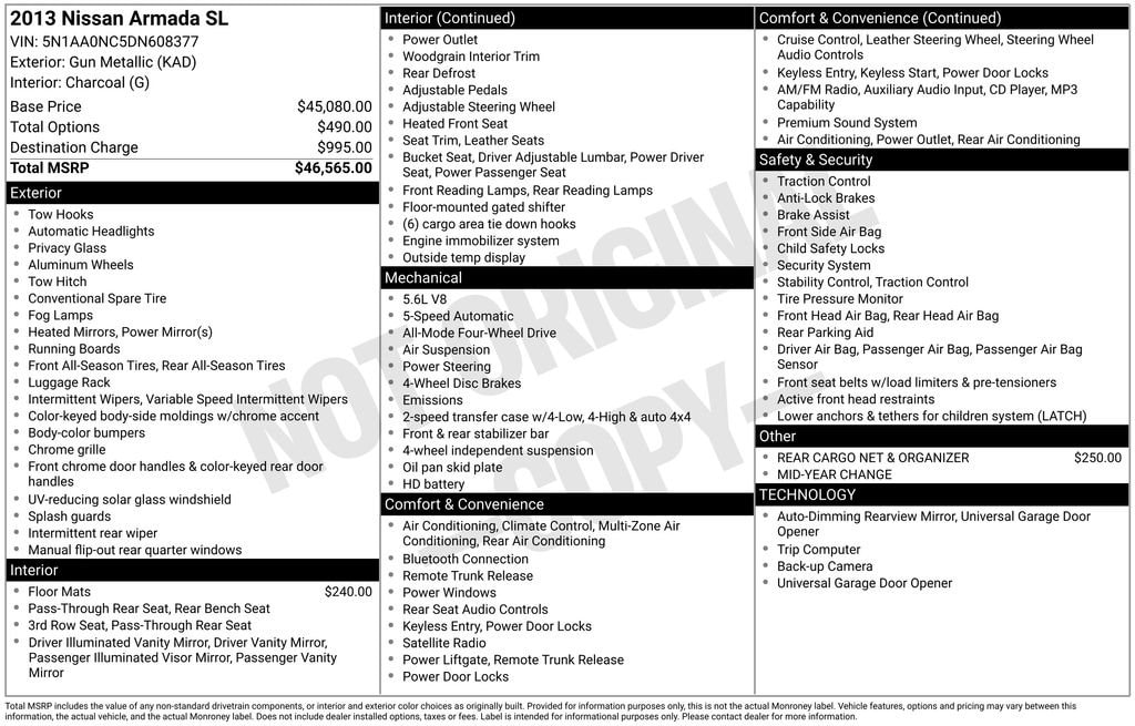2013 Nissan Armada SL Gun Metallic Pearl Metallic 4WD 5.6L V8 DOHC 32V Endurance
