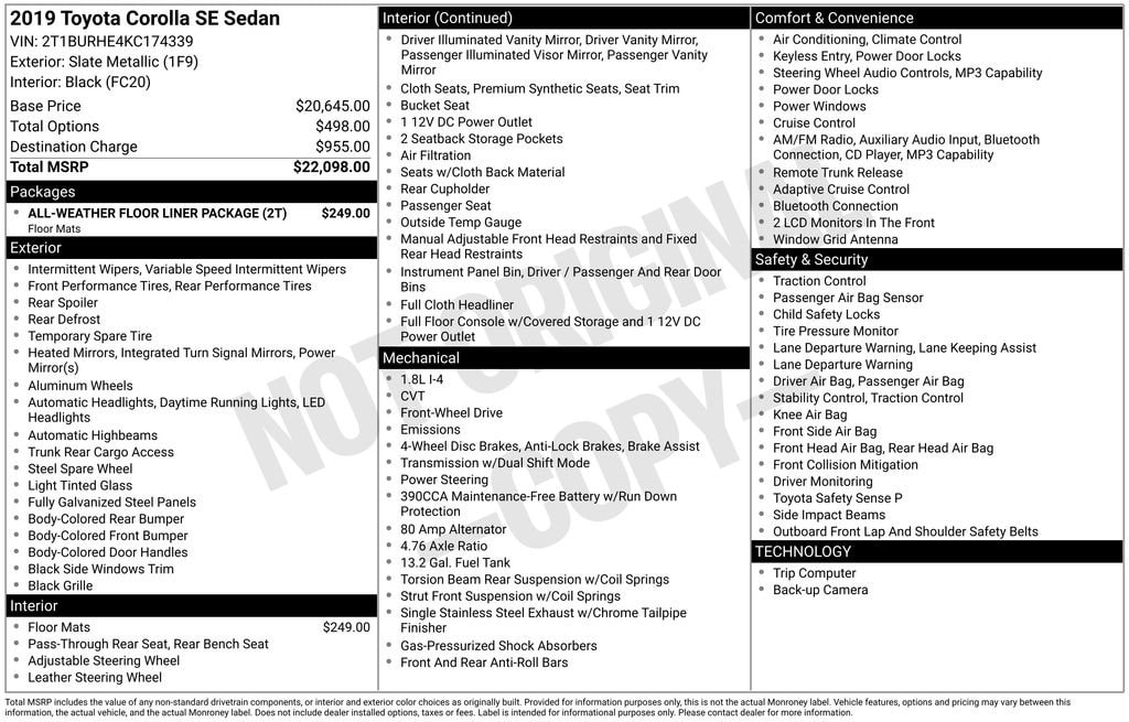 Recent Arrival!2019 Toyota Corolla SE Slate Metallic FWD 1.8L I4 DOHCAwards:* 2019 KBB.com Brand Image Awards * 2019 KBB.com Best Resale Value Awards* FORWARD COLLISION ALERT *, * LANE DEPARTURE WARNING *, * REAR VISION CAMERA *, Air Conditioning, Power door mirrors, Power windows, Radio: Entune Audio w/6.1 Screen.Tax, title, doc fee ($251.05), optional accessories, extra. We invite you in to take a test drive! Stoops Buick-GMC in Plainfield, Indiana, family owned and proudly serving our community since 1990. We have an A+ rating with the Better Business Bureau and have been a CarFax Top Rated Dealer 5 years in a row! Stoops Buick-GMC: conveniently located only 5 minutes west of the airport and mile and a half north of I-70 on SR 267 in Plainfield. Proudly serving Plainfield and the surrounding communities of Greenwood, Indianapolis, Mooresville, Avon, Brownsburg and more. Call us direct at 317-839-7771! Thank you for the opportunity to earn your business!We strive to ensure the accuracy of the information on this site. However, mistakes can happen. To verify any information listed on this site please call us at 317-839-7771 or visit us in store.